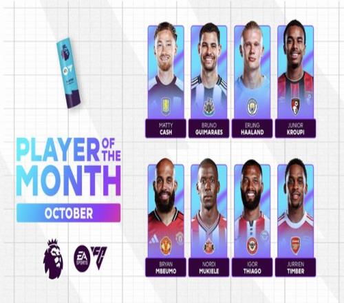 雷速体育10月30报道 英超官方公布了10月最佳球员的候选名单,其中,哈兰德、姆伯莫、廷贝尔、吉马良斯在列。