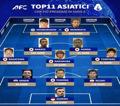 德转列意甲出场数最多的亚洲球员11人阵容: