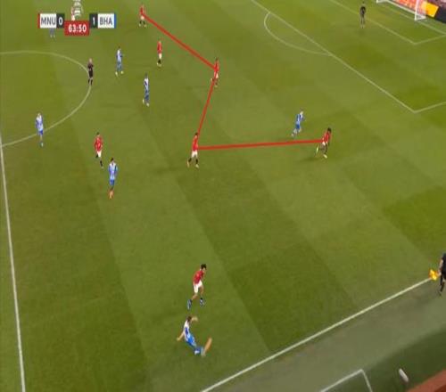 这次进攻没打成,被布莱顿倒到另一侧之后,曼联中场极度空虚,乌加特缩进后卫线,而约罗更没有弹出来的想法,所以当你觉得库尼亚是不是在和谢什科打双前锋的时候,他又在这次防守里回到了左边路: