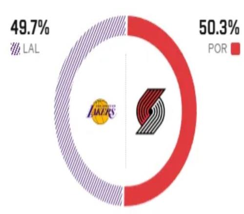 这是两队本赛季的第三次交锋,前两次交手,湖人开拓者各赢一场,算是旗鼓相当。赛前,美媒ESPN对本场比赛进行了胜率预测,湖人队胜率仅有49.7%,开拓者胜率则为50.3% ,也算是半斤八两。