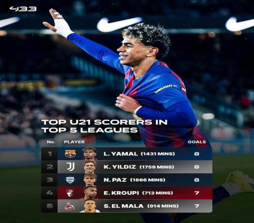 本赛季五大联赛U21球员进球榜:亚马尔、伊尔迪兹、帕斯8球第1