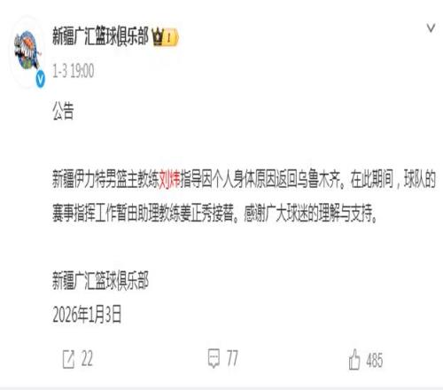 新疆伊力特男篮主教练刘炜指导因个人身体原因返回乌鲁木齐。在此期间,球队的赛事指挥工作暂由助理教练姜正秀接替,感谢广大球迷的理解与支持。