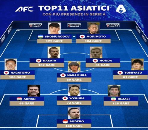 意甲出场数最多的亚洲球员11人阵容:长友佑都、中田英寿领衔